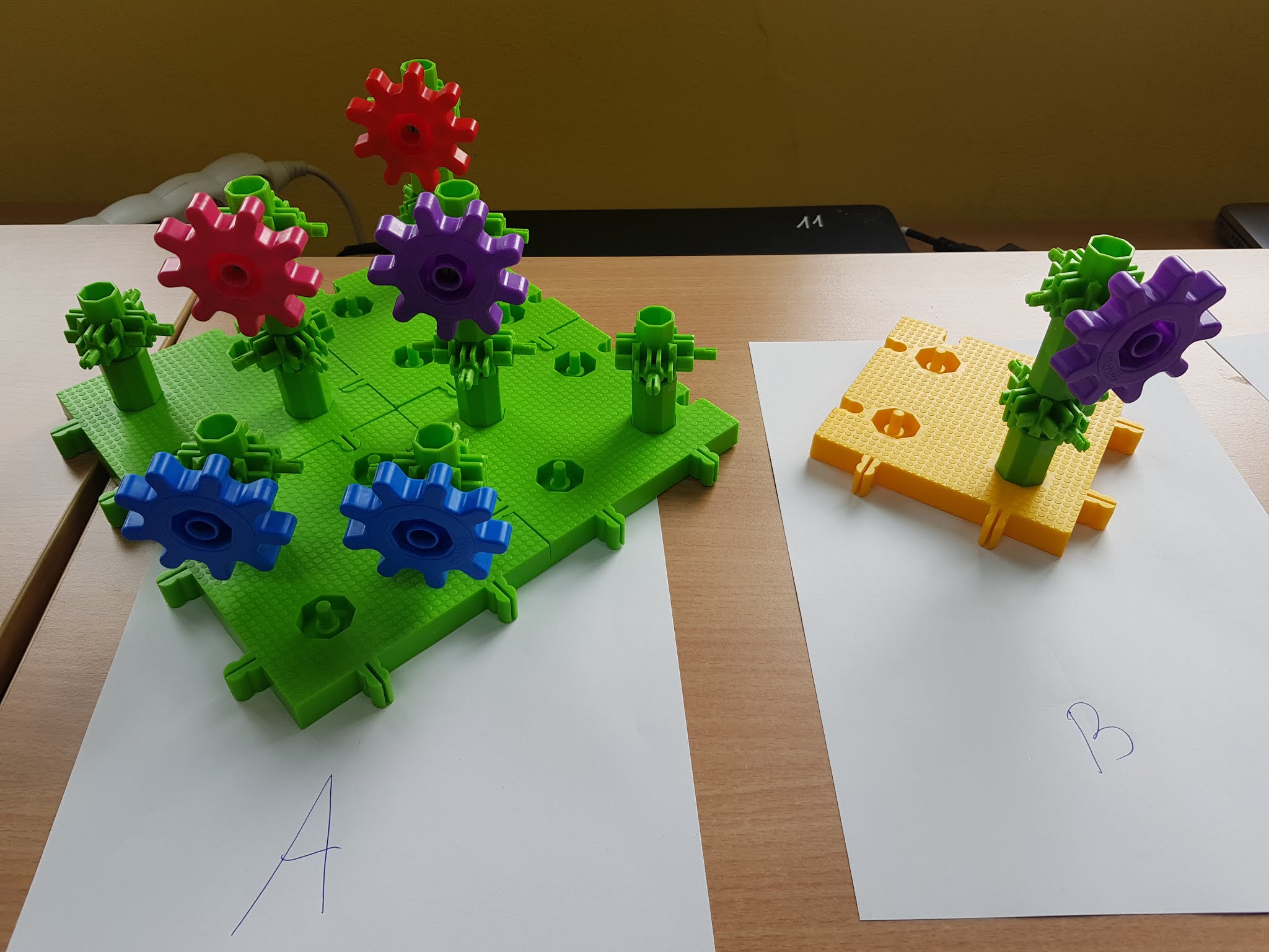 Na lekcji z klasą 5 utrwalaliśmy stopniowanie przymiotników. Ustaliliśmy zasady pracy i naszykowałam stoper. Najpierw uczniowie mieli 5 minut na zbudowanie kwiatka. Potem każdy postawił gotową konstrukcję na przykotowanych przeze mnie kartkach oznaczonych literami A-J. Następnie razem porównywaliśmy kwiaty zapisując zdania (na tablicy i w zeszycie).